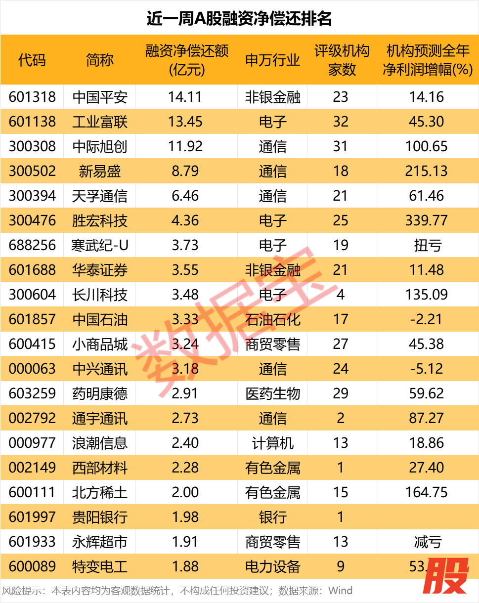 73股融资净偿还额超过1亿元。中国平安、工业富联、中际旭创、新易盛、天孚通信融资净偿还额排名前五,依次为14.11亿元、13.45亿元、11.92亿元、8.79亿元、6.46亿元。