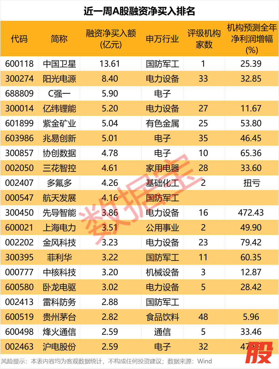 个股方面,106股融资净买入额在1亿元以上。中国卫星以13.61亿元的融资净买入额居首,阳光电源净买入额8.4亿元,排名第二,C强一、亿纬锂能(维权)、紫金矿业、兆易创新等随后,融资净买入额均在5亿元以上。