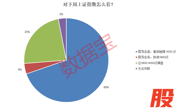 A股持续震荡走高,投资者信心回升,对于下周市场看涨的人数占比大幅提高。数据显示,69%的投资者认为下周市场将“震荡走高,重新触摸4000点”;23%的投资者认为市场将“在3800—4000点横盘”,仅有4%的投资者明确看空市场。
